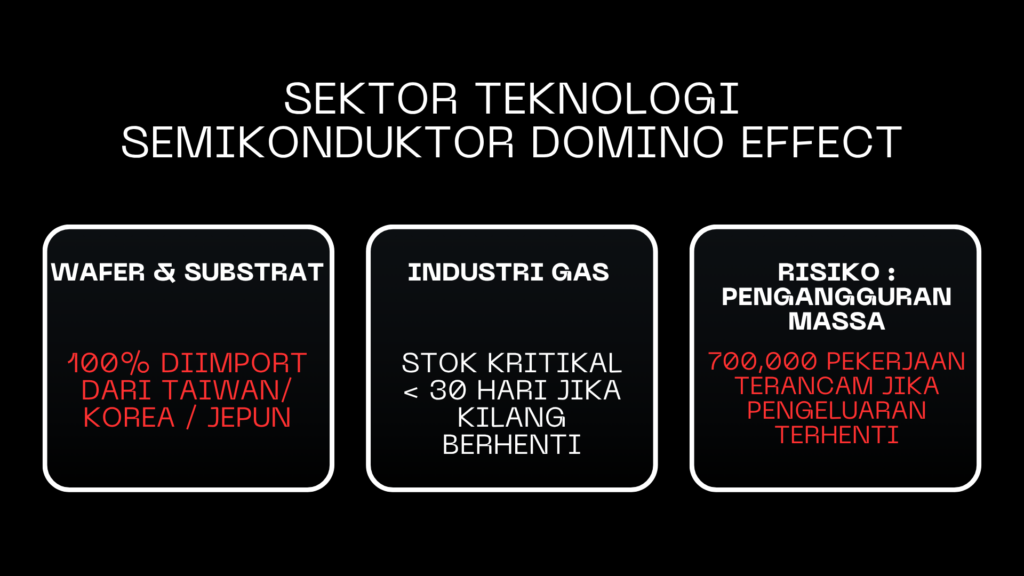 Walaupun Malaysia antara pengeluar terbesar dalam rantaian pembungkusan cip global, hampir semua bahan mentah kritikal seperti wafer silikon dan gas industri diimport. Stok gas khas untuk kilang semikonduktor hanya bertahan kurang 30 hari jika bekalan terganggu. Lebih 700,000 pekerja dalam industri ini boleh kehilangan kerja dalam masa singkat, mencetuskan krisis ekonomi dalaman.