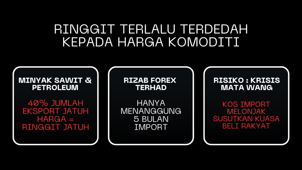 Ringgit Malaysia bergerak hampir selari dengan harga minyak mentah dan minyak sawit. Apabila harga komoditi global jatuh, ringgit turut jatuh, menyebabkan kos import melonjak. Rizab forex Malaysia pula hanya mampu menanggung sekitar 5 bulan import, yang sangat terhad berbanding negara serantau. Gabungan ringgit lemah dan harga import tinggi boleh meruntuhkan kuasa beli rakyat dengan cepat.