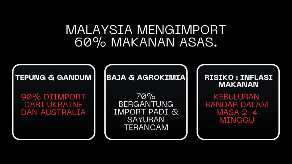 Fakta 1 — Kebergantungan makanan import yang ekstrem Malaysia mengimport lebih 60% bekalan makanan asas. Gandum, tepung, dan baja pertanian hampir sepenuhnya bergantung pada negara luar. Jika terjadi perang, bencana iklim, atau sekatan perdagangan, stok makanan bandar boleh habis dalam masa 2 hingga 4 minggu sahaja. Isu ini sangat merbahaya kerana Malaysia tidak mempunyai rizab strategik makanan yang mencukupi untuk rakyat 33 juta orang.